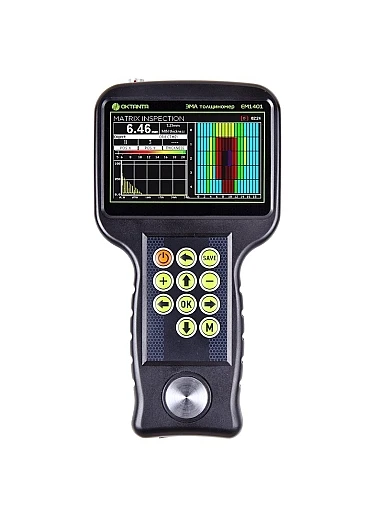 Толщиномер EM1401 UT имеет цветной дисплей, защищённый ударопрочным стеклом. Как и все ЭМА толщиномеры выпускаемые нашей компанией, толщиномер EM1401 UT использует специальный алгоритм обработки данных, который позволяет корректно измерять толщину в автоматическом режиме при наличии мешающих факторов, таких как анизотропия металла, наличие нескольких отражателей, наличие внешних помех. Помимо автоматического режима измерения толщины прибор позволяет использовать ручные режимы измерения по первому эхо-сигналу и по разности между любыми двумя эхо-сигналами. Ручной режим рекомендуется использовать на сильно корродированных объектах.