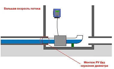 Существует несколько видов установки комплекса. Изначально выясняется, позволяют ли параметры потока применить сужение диаметра расходомерного участка (РУ). Такой тип монтажа предпочтительнее, так как он позволяет уменьшить габаритные размеры РУ и снизить стоимость комплекса (иногда существенно).