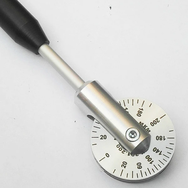 Колесный толщиномер покрытий КТ-201 «Эксперт» комплектуется тремя измерительными колесами: 0-200 мкм, 0-600 мкм, 0-1500 мкм. При прокатывании колесного толщиномера по сырому покрытию, на центральном ободе остается отпечаток покрытия. Толщина покрытия считывается по шкале в месте, где отпечаток покрытия заканчивается. Толщиномер мокрого слоя позволяет производить измерения как на плоских, так и на изогнутых поверхностях. Для использования в труднодоступных местах колесный толщиномер комплектуется рукояткой длиной 20 см.