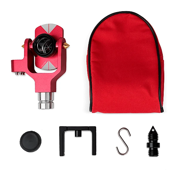 Фрезерованный U-образный держатель геодезического отражателя выполнен из анодированного алюминия и оборудован пузырьковым уровнем с поддержкой самостоятельной юстировки. Колба ватерпаса "утоплена" в металлической конструкции, что исключает ее случайное повреждение. Горизонтальная ось, обеспечивающая возможность произвольного наклона призмы, снабжена коническими выступами, что вместе с марками на креплении отражательного элемента упрощает наведение тахеометра на его центр.
