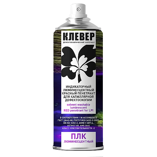 Красный флюоресцентный пенетрант КЛЕВЕР ПЛК сочетает в себе возможности цветного и люминесцентного капиллярного контроля.Смывается водой и растворителем.