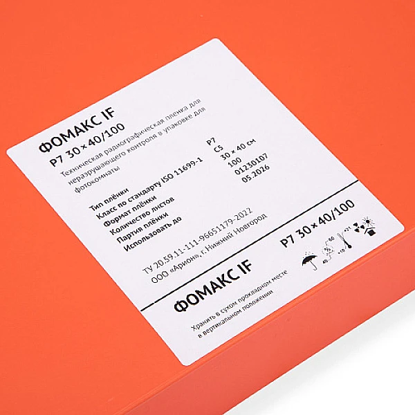 Пленка ФОМАКС Р7 производится в формате листовой радиографической пленки. Пленка листового формата упаковывается по 100 листов в светонепроницаемый конверт.