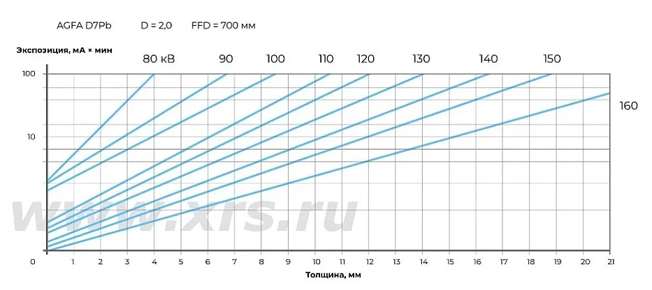 Время экспозиции, величина анодного напряжения и анодного тока настраиваются вручную через пульт управления: диапазон установки напряжения составляет от 50 до 160 кВ, диапазон силы тока — от 0,5 до 5 мА. Это позволяет подбирать оптимальный режим просвечивания в каждом конкретном случае.