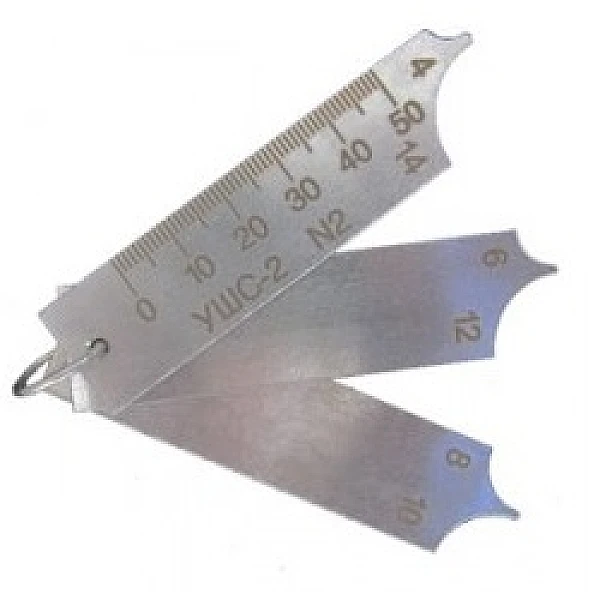 Универсальный шаблон сварщика УШС-2 — это комплект инструментов для контроля качества сварных соединений, визуальным способом. Устройство представляет собой три металлических лепестка снабжённых торцевыми выемками, соответствующими определённым катетам угловых швов. Каждый лепесток имеет две выемки разного размера. Таким образом, при помощи УШС-2 возможно проводить исследования швов шести размеров с угловыми катетами от 4 до 14 см.